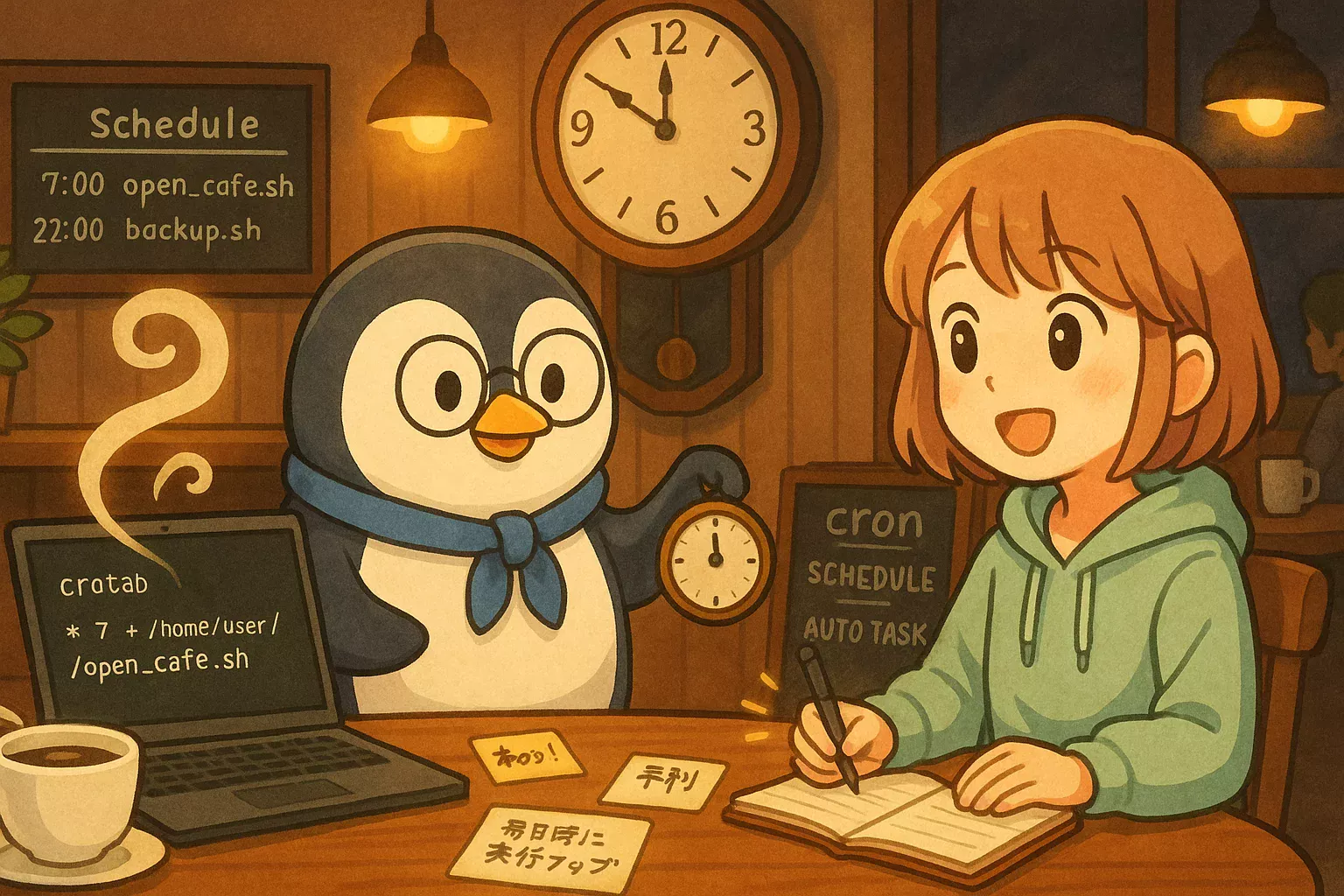ターミナルでcronコマンドを使ってプログラムを決まった時間に自動実行する方法を学びます。朝の開店や夜の片づけのように、毎日の作業を自動化して効率アップ!LinuxやMac…