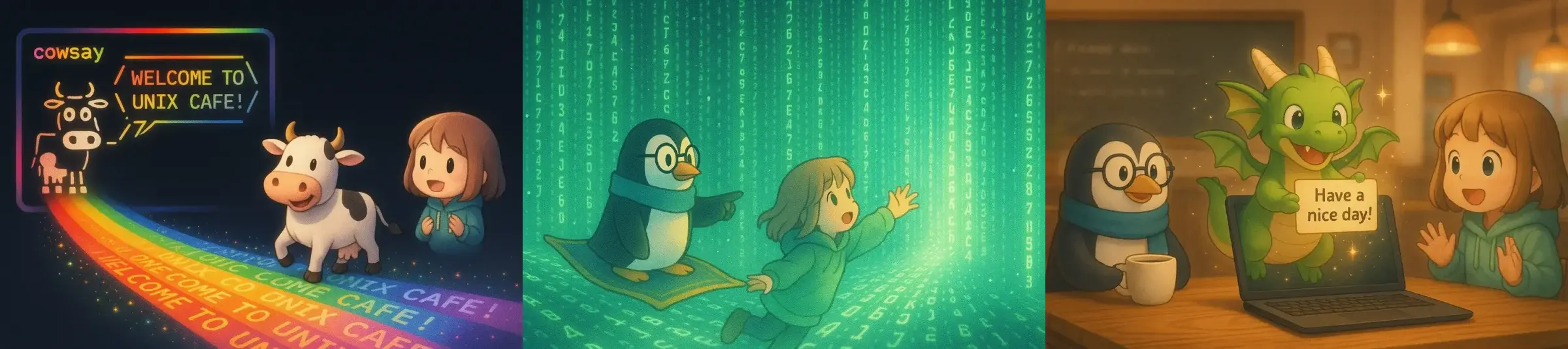 はじめての方へ UNIX Cafe は、ターミナルや Linux の世界を、むずかしい言葉をできるだけ使わずに、カフェで会話するような気持ちで学べる場所です。 黒い画面に、少し身…