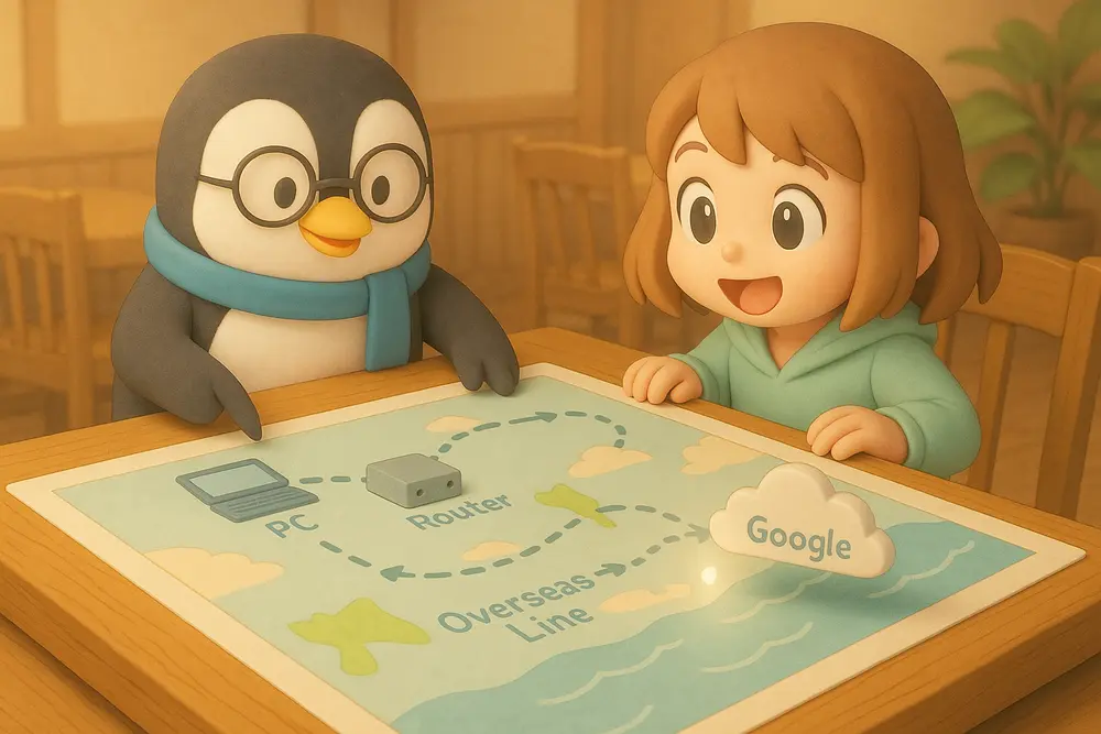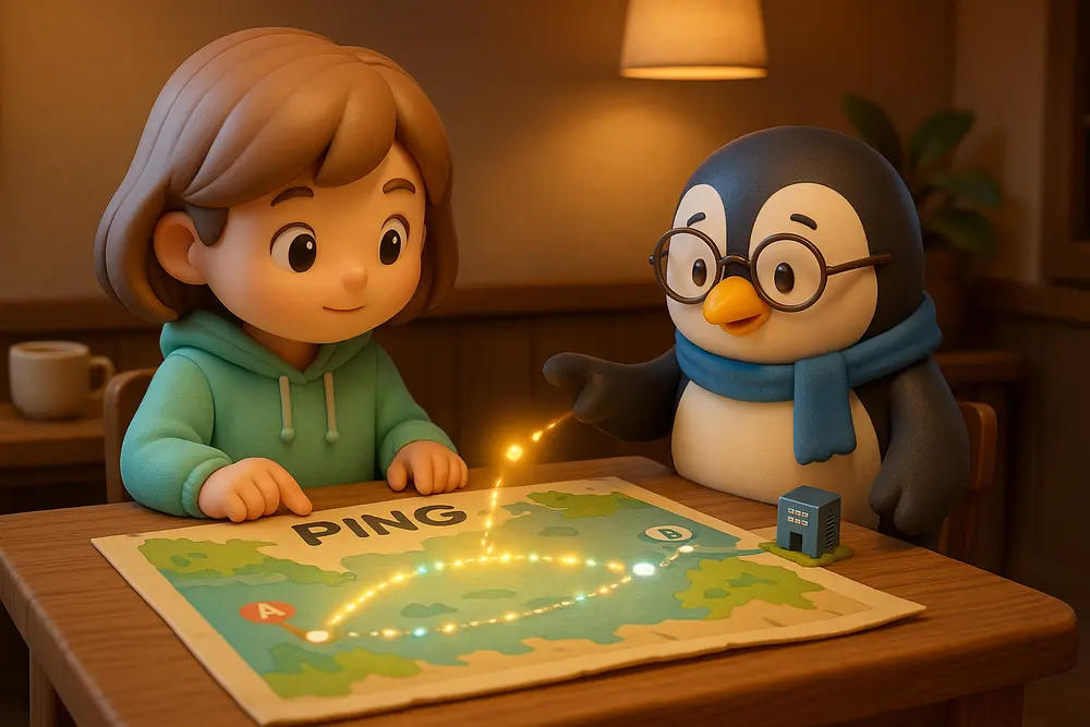 ネットワークの状態を調べる基本コマンド「ping」を、ユニ先生とミナちゃんの会話形式でわかりやすく解説します。ping google.com の意味、回数指定 -c、間隔指定 -i、停止…