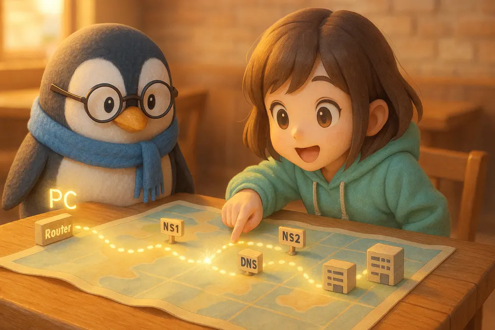 nslookup と dig の基本的な使い方を、ユニ先生とミナちゃんが会話形式でやさしく解説します。ドメイン名からIPアドレスを調べる方法、逆引き、dig +short の便利な使い方…